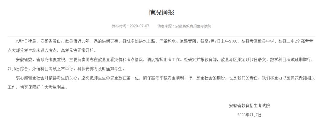 据安徽省教育招生考试院消息,7月7日凌晨,安徽省黄山市歙县遭遇50年一遇的洪涝灾害,县城多处洪水上路、严重积水、道路受阻。截至7月7日上午9:00,歙县考区歙县中学、歙县二中2个高考考点大部分考生均未进入考点,高考无法正常开始。歙县考区原定7日语文、数学科目考试延期举行,8日综合、外语科目考试正常举行。因暴雨推迟的歙县高考语文数学9日补考。为保证8日顺利开考,当地在考点外连夜架设浮桥。抢修人员称,歙县中学浮桥长60米,歙县二中浮桥长300米。当地发布应急交通保障线路,为考生护航。