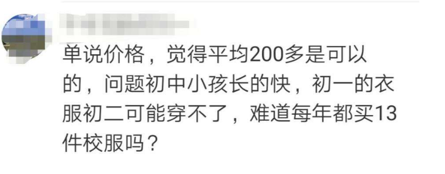 事实上,校服存在着“年年买年年换”的问题,退一万步讲,即使校服的质量过关,但高昂的费用又有多少家庭能承担的起呢?这给许多父母带来的负担可想而知。不仅如此,2300元的校服费远远超出市场价,无利不起早,又有谁能保证暴利落入谁人口袋呢?