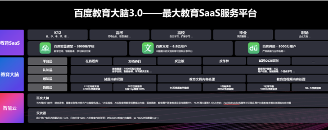会上,百度正式发布“百度教育大脑3.0”。百度教育大脑是在百度大脑基础上,基于人工智能、大数据和云计算,赋能教育产品和教育场景,为用户提供内容和智能服务的能力引擎。