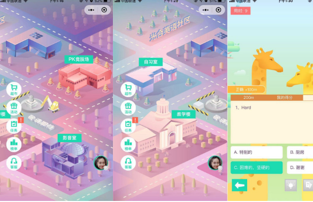 在用户将学习数据留在小程序后,光合英语会分析用户行为和偏好,匹配合适的学习搭档;并通过融合社交元素的虚拟社区活动,鼓励分享和交流,绑定学习和社交。归根到底,学习从来都没有被限定成必须一个人来完成的行为,竞争环境可以互相激发学生学习的上进心,有同伴的鼓励和同行一样是学的更长远的条件之一。但不过分社交同样是一个“好好学习”的大前提,对此光合英语也表示不会把它开发成完全社区环境。
