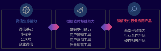 因此,微信支付将所能理解的产品和企业、行业能够结合的地方,划分了三个工具箱:微信生态能力工具箱、微信支付基础能力工具箱和微信支付行业应用产品工具箱。企业可以根据自身需求,自由拼装出适合自己的多元产品矩阵。