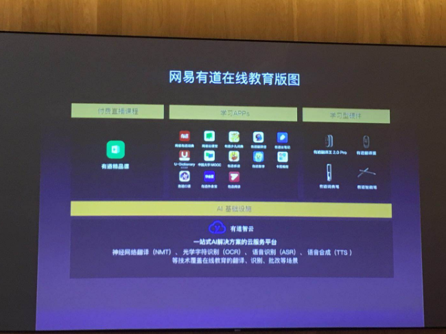 根据发布会内容显示,网易有道在线教育版图包括付费直播课程、学习APPs和学习型硬件三部分组成。其中付费直播课程为“有道精品课”,学习APPs就涵盖此前网易云课堂、中国大学MOOC等原属于网易教育事业部产品。