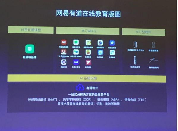 网易有道CEO周枫将业务分为四部分,付费直播课程的“有道精品课”、学习APPs、学习型硬件和AI基础设施。在这其中,合并过来的网易云课堂、中国大学MOOC产品均是学习APPs矩阵的一部分。