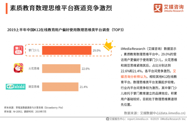 近日,艾媒发布《2019年上半年中国K12在线教育行业的研究报告》,报告从多方面观察,以融资、口碑以及用户偏好为维度,深入探究国内K12在线教育不同赛道的发展现状。其中,在线教育品牌掌门学堂表现亮眼,旗下掌门少儿、掌门1对1分别在素质教育数理思维赛道和在线1对1全科辅导赛道中领跑,成绩斐然。