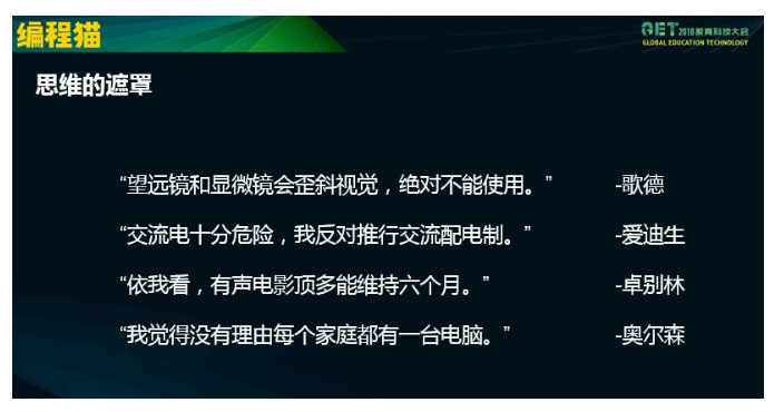第一句话,望远镜和显微镜,科学家说它会歪斜你的视觉,绝对不能用这个东西。第二句话,科学家说交流电非常危险,这个非常著名,大家应该都知道是谁。后边那两个,大家可以看看,分别都是谁讲的。有声电影,最多只能维持6个月,这是卓别林讲的。后面一个是奥尔森说的,他觉得没有理由每个家庭都有一台电脑,所以他被IBM和微软颠覆掉了。