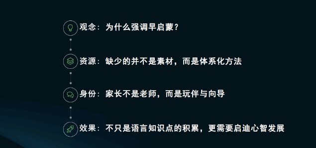 再然后一定要说到家庭教育。在0-6岁的任何一种学习中,家庭场景都承载了非常重要的作用。哪怕是孩子上了幼儿园,他在家里待的时间也非常长。能不能直接把早教机构或者幼儿园课程搬到家里呢?不行的。对于一个正常的家庭来讲早教机构的这些豪华设施,爬、翻、撞、打这些东西是没有的。幼儿园是一个群体环境,小朋友可以坐一圈,他也是做不到的。所以,我们要利用家长可以做到的事情,家庭场景下可以做到的事情去重构英语启蒙这个概念。
