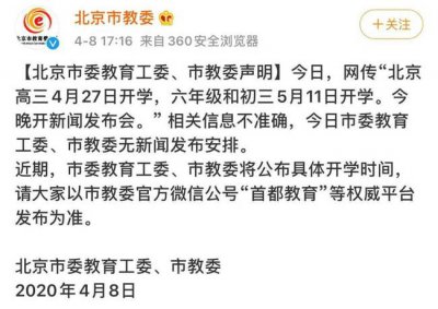北京辟谣开学时间 称相关信息不准确