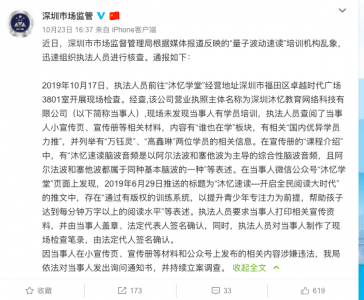 深圳市监局通报“量子波动速读”培训机构 已对当事人发出询问通知书