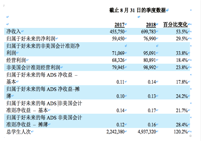 今日,好未来公布其截至2018年8月31日的2019财年第二季度未经审计财务报告。根据财报披露,2019Q2好未来营收6.998亿美元,同比增长53.5%,净利润7700万美元,同比增长29.5%。此外,还公布了股份回购项目,将在未来12个月内回购价值1亿美元的普通股。