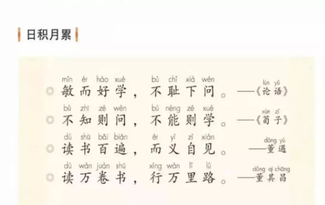细心的家长会发现,小学一年级语文教材语文园地里设有《日积月累》,是要求孩子背诵并测验默写的。这一栏里经常会出现文言文,一年级下册已经要求背诵并理解《论语》选段“敏而好学,不耻下问”了!