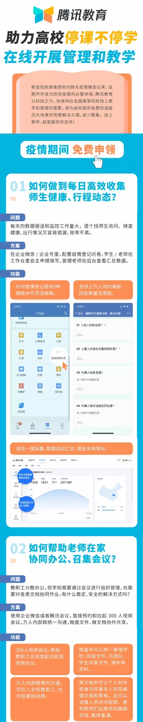 在每日收集师生健康、行程动态方面,高校可以在企业微信/企业号里,配置疫情登记问卷。学生/老师在工作台里自主申报填写,管理老师可以在后台查看汇总数据;在老师在家协同办公、召集会议方面,可以使用企业微信或者腾讯会议,预约和拉起300人视频会议,微盘文件、微文档可以协作共享;在在线教学方面,腾讯课堂支持在线直播授课,老师可以一键开通直播教室,邀请学生在手机或电脑上听课;在疫情公布方面,高校可以在企业微信里配置乐享校园社区,用作官方消息发布和问答等。