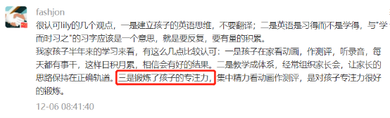 2. 线上新课一对一,吸收好。相比线下教室嘈杂、不可控的环境,孩子在线上可以无干扰、安静地观看新课内容,而且家长还可以挑选孩子精力最好的时间让孩子观看新课,孩子很容易进入故事的情节中。所以越来越多的家长发现,孩子们的专注力越来越好,以前只能坐5分钟的孩子、经过3个月学习能盯下来20-30分钟了,家长十分惊喜,可见线上新课对培养孩子的专注力大有裨益。