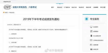 2月21日10时发布!2019下半年大学英语四六级考试成绩来啦】#2019下半年英语四六级成绩# 今日,教育部考试中心发布了《2019年下半年考试成绩发布通知》,2019年下半年全国大学英语四、六级考试(含口语)成绩将于2020年2月21日发布。