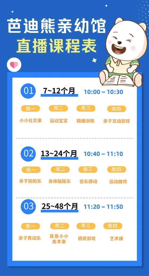 尽管这样,孩子的学习和成长却不能少。为了解决孩子假期无法上课的问题,芭迪熊亲幼馆在假期推出线上直播系列课程!