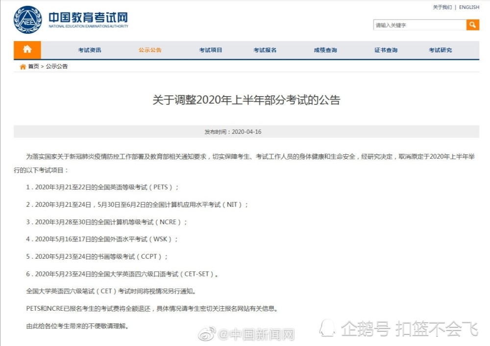 据中国教育考试网消息,为落实国家关于新冠肺炎疫情防控工作部署及教育部相关通知要求,切实保障考生、考试工作人员的身体健康和生命安全,经研究决定,取消原定于2020年上半年举行的以下考试项目: