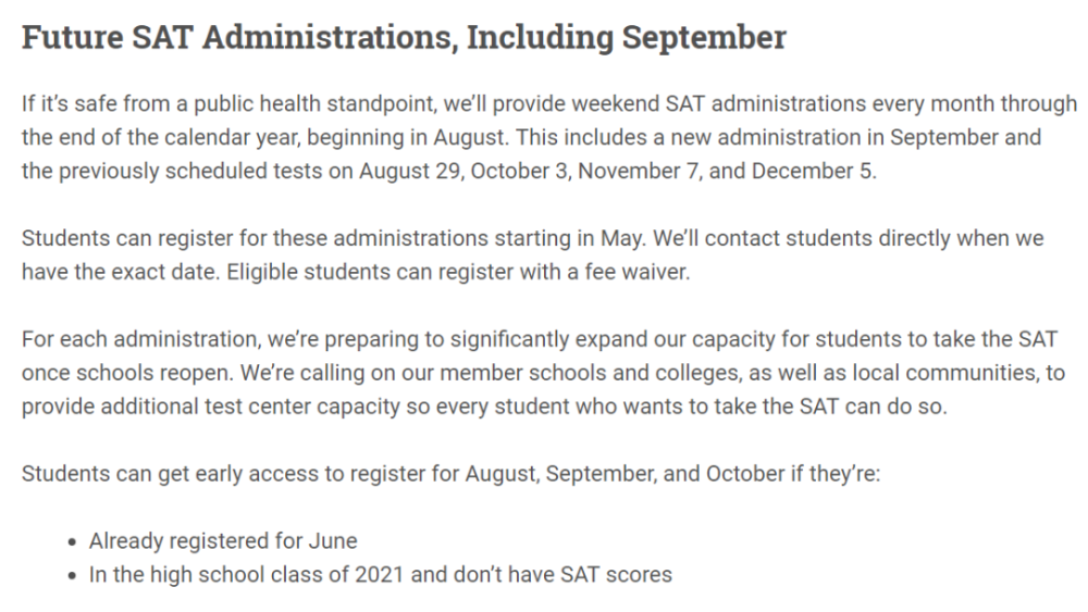 考生们从5月起可以开始注册报名,符合下列两种情况的同学可以优先报名8月、9月和10月的考试:(1)已经注册了6月的考试;(2) 将于2021年毕业且还没有SAT成绩的学生。