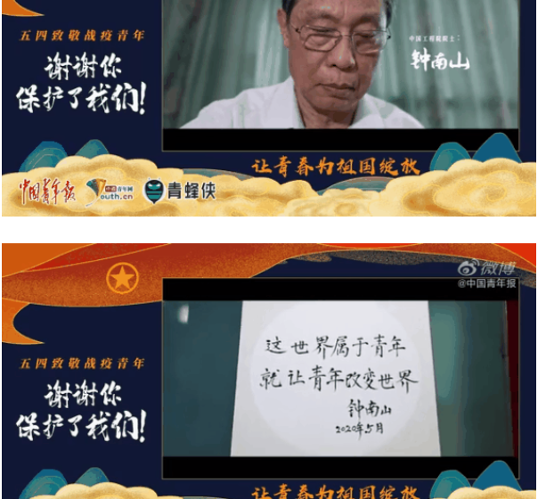 五四青年节了,今年注定是一个特别的五四.五四青年节前夕,钟南山点赞广大青年,在抗击新冠肺炎战斗中起到了主力军作用!