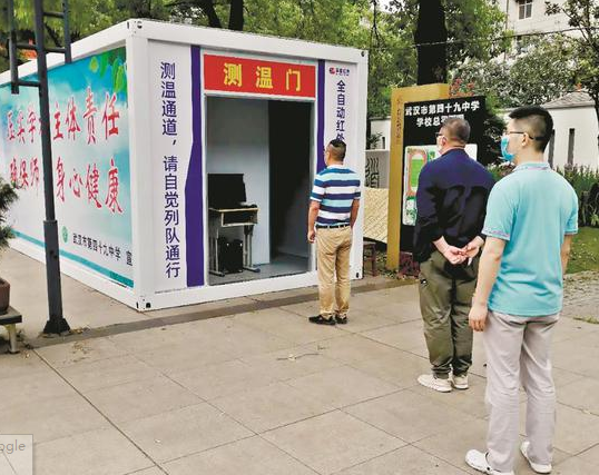 武汉市第四十九中学开学后将实施一日三检制度,每日早中晚,由班主任和班级卫生委员对所在班级的学生进行3次体温检测。“五一”期间,该校还在前广场加装了全自动红外热成像测温仪。
