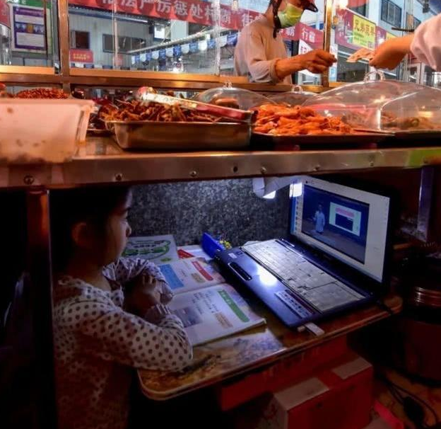 近日,一组小女孩在案板下上网课的照片感动众多网友.女孩叫柯恩雅,今年七岁是湖北五峰渔洋关镇一年级的学生.4月3日复工后,父母在集贸市场卖卤菜,她就一直在卤菜店的案板下上网课,已坚持一个多月.