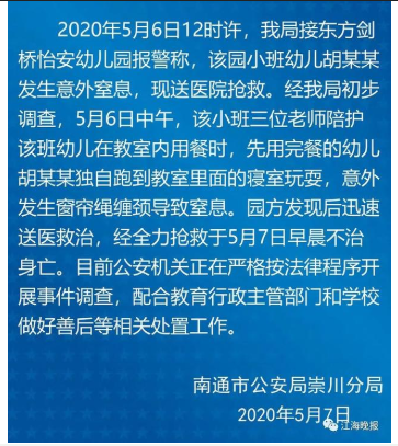 南通市公安局崇川分局5月7日晚发布警情通报,2020年5月6日12时许,崇川分局接东方剑桥怡安幼儿园报警称,该园小班幼儿胡某某发生意外窒息,现送医院抢救.经初步调查,5月6日中午,该小班三位老师陪护该班幼儿在教室内用餐时,先用完餐的幼儿胡某某独自跑到教室里面的寝室玩耍,意外发生窗帘绳缠颈导致窒息.园方发现后迅速送医救治,经全力抢救于5月7日早晨不治身亡.目前公安机关正在严格按法律程序开展事件调查,配合教育行政主管部门和学校做好善后等相关处置工作.