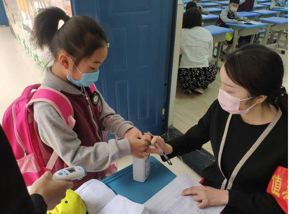 上午8点,在郑州市实验小学,首批返校学生依次间隔排队,有序通过人脸测温仪,在老师的指引下,进班前手部消毒再次测温。