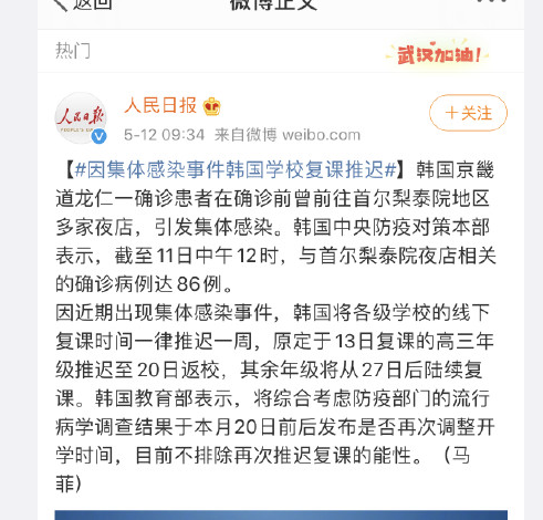 因近期出现集体感染事件,韩国将各级学校的线下复课时间一律推迟一周,原定于13日复课的高三年级推迟至20日返校,其余年级将从27日后陆续复课。韩国教育部表示,将综合考虑防疫部门的流行病学调查结果于本月20日前后发布是否再次调整开学时间,目前不排除再次推迟复课的能性。