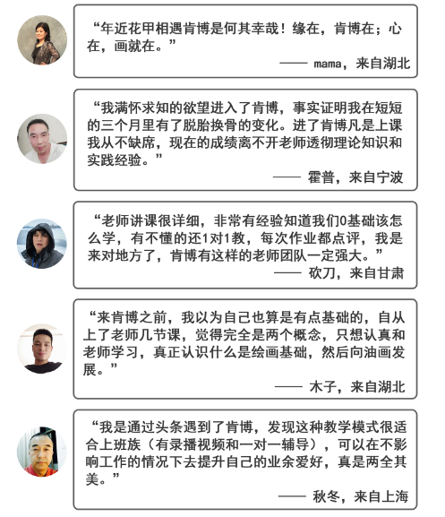 从这些学员感言中,我们可以看到,肯博美术的学员有年近花甲的老人,也有普通的上班族,以及有基础想精进的绘画爱好者。所以,学习美术虽非一日之功,但年龄绝不是问题,如果你想学习美术,如果你正在寻找一家美术教育机构,不妨来肯博美术在线教育。学习早一刻,乐趣多一分,专业的肯博美术将永远乐意帮助您的成长!