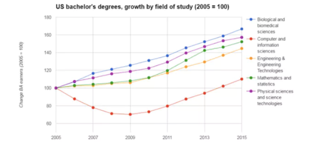 相关数据显示,在美国,与其他STEM专业(科学、技术、工程、数学)相比,“计算机科学”项目的本科毕业生数量更少(如下图所示)。近几年来,研究者们也通过大量研究探索,学生对计算机科学的兴趣为什么会相对较低。如今作为一名大学生的我也花了数周时间,与相关人员进行谈话,了解其中奥秘。对话人物包括为Google提供顾问服务的教授、有志于从事计算机科学研究的高中生,以及期望学生在计算机领域学有所成的导师们。结合自身研究,我总结出了学生不热爱计算机科学(computer science, CS)的三点原因。
