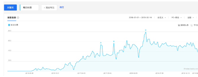 根据百度指数,知识付费关注度从2016年开始逐渐上涨,至2018年初关注达到峰值,随后整体开始趋于平稳并有所下降。但从诞生起,知识付费一直与流量生意紧紧绑在一起。