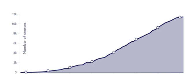 截至年底,全球有超过900所大学提供了约11,400个慕课课程,仅2018年便有2000个新增课程。另一个有趣的现象,即课程数量的增长速度持续高于慕课学生人数的增长速度,以及“由于用户增长没有跟上,使得每个课程的用户越来越少”。