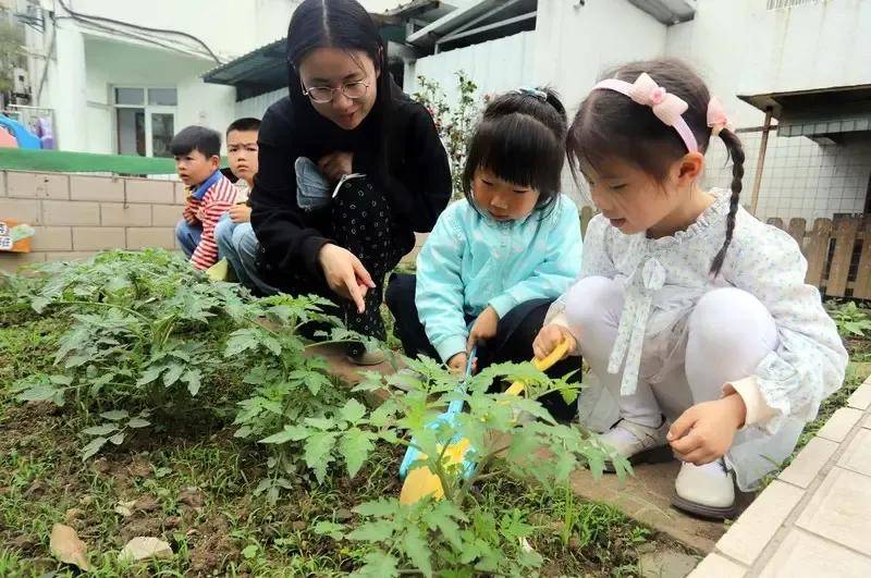 江苏省苏州市姑苏区杨枝实验幼儿园孩子们在“微田园”内进行拔草、松土等劳动。