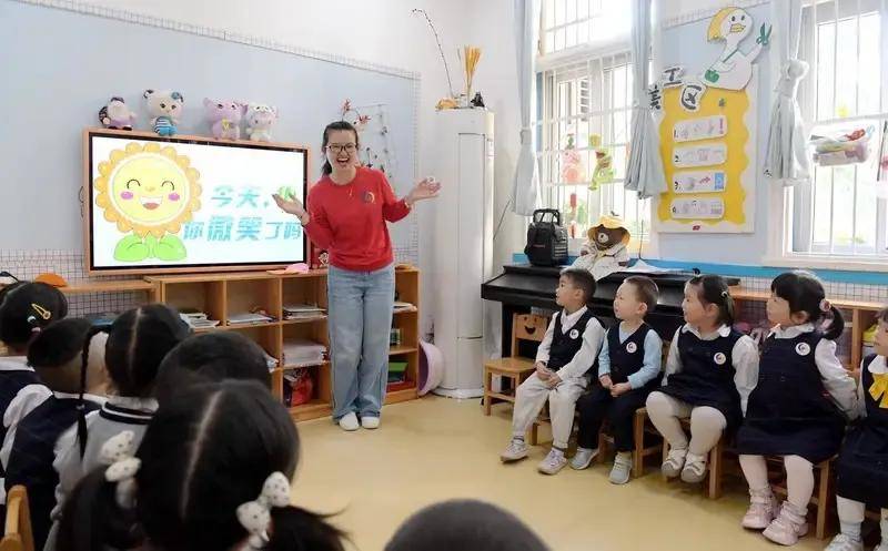 2024年5月8日,安徽省合肥市蜀山区飞虹社区孩时乐幼儿园,老师向小朋友介绍微笑日。图源IC photo。
