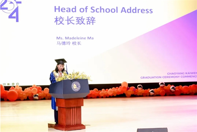 毕业临别之际,朝阳凯文学校校长马德玲女士上台致辞,送上对毕业生殷切的嘱托: