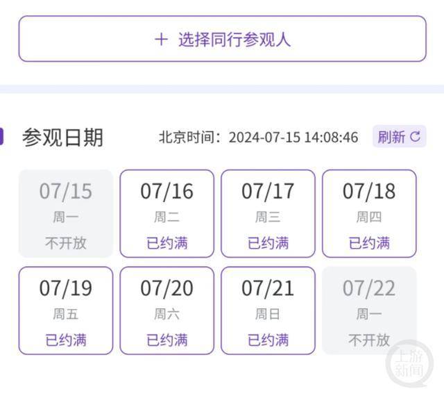 15日下午,上游新闻记者在“参观清华”小程序上看到,16日-21日的名额都已经显示约满,不过下午5点后,可以提交抽签申请,四个时间段均显示“充足”。