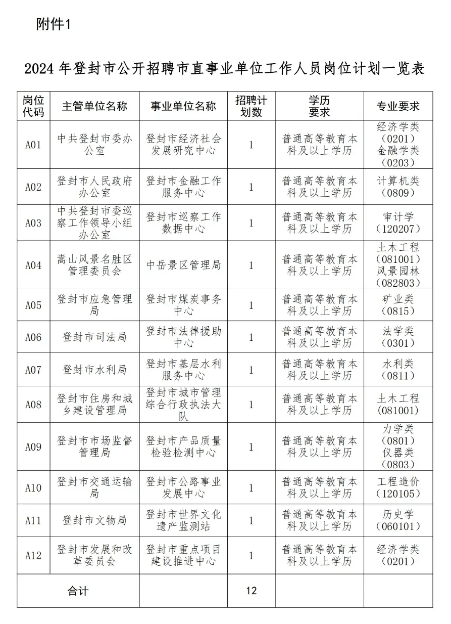 附件:1.2024年登封市公开招聘市直事业单位工作人员岗位计划一览表