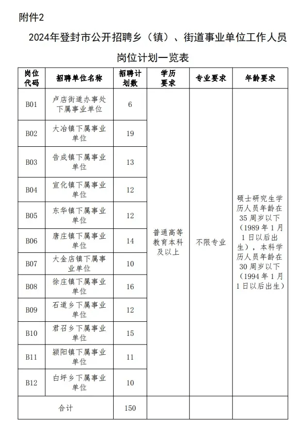 本次共计划为12个市直事业单位公开招聘工作人员12名(具体岗位明细见附件1);为12个乡(镇)、街道公开招聘工作人员150名(具体岗位明细见附件2)。