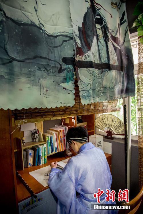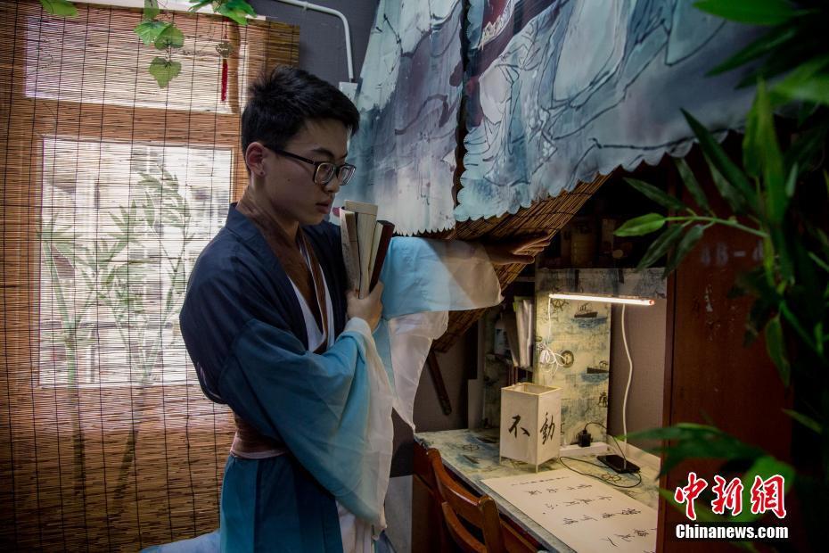 一名大学生在他们的“古风宿舍”内。