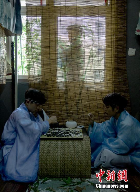 大学生在他们的“古风宿舍”内下棋。