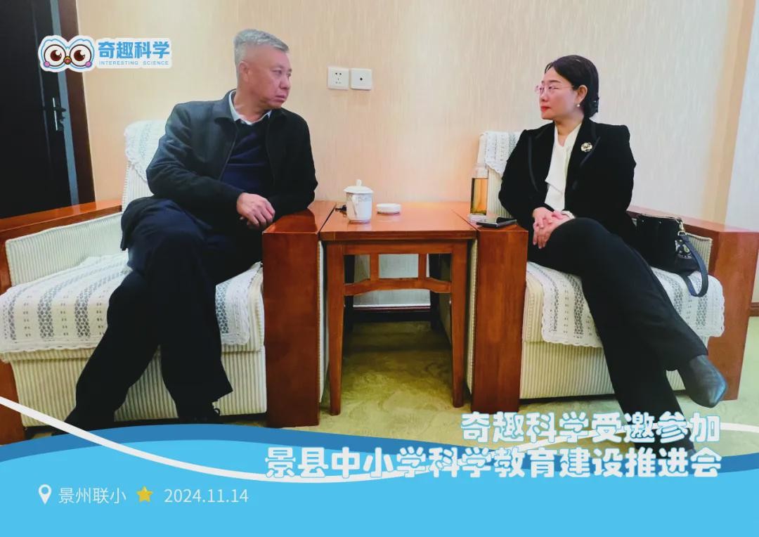 会议开始前,景县教育局局长于洪彬先生与奇趣科学创始人张芳女士进行了深入的交流。在交流中,于局长表示,河北省教育厅经过严格筛选与评估,正式将景县确定为河北省中小学科学教育的实验区,这一殊荣使得景县成为衡水市唯一入选的县份。面对这一机遇,景县教育局表现出了极大的决心与支持,明确表示将给予必要的资金倾斜,并动员全县的教育资源,集中人力物力,全力以赴推进这一科学教育项目的实施。