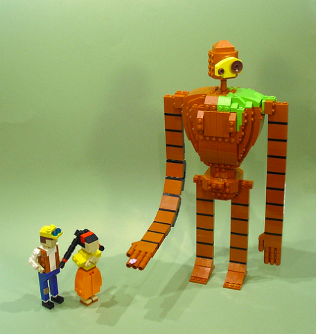《天空之城》的古代兵器机器人,绝对是宫崎骏动画里热门“角色”之一,机器人悲伤的面孔像是展现了他被废弃的孤寂,手指上的小花也被作者透过乐高复制出来,营造出经典的机器人送花场景,超级温馨可爱呢~~