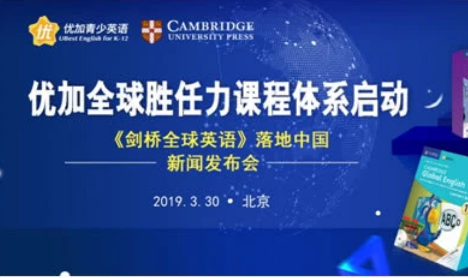 2019年3月30日,优加青少英语与剑桥大学出版社联合举办的“全球胜任力课程体系启动新闻发布会”在北京皇冠假日酒店举行。双方宣布,由优加青少英语独家引进的《剑桥全球英语》(Cambridge Global English)课程全面落地中国。围绕该教材,优加青少英语将着力打造浸润式全英文国际学校课堂,以英语为工具带来多学科学习体验,开展跨文化交流,引导英语教育由关注应试、单纯技能学习,向注重培养青少年核心素养、全球胜任力等方向转变,开启青少英语教育的新时代。