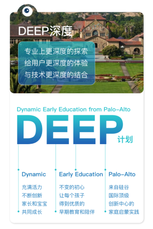 「小步在家早教DEEP计划」 DEEP是深度的意思,同时DEEP又是Dynamic Early Education from Palo-Alto的缩写,是小步在家这套早教计划的来源。