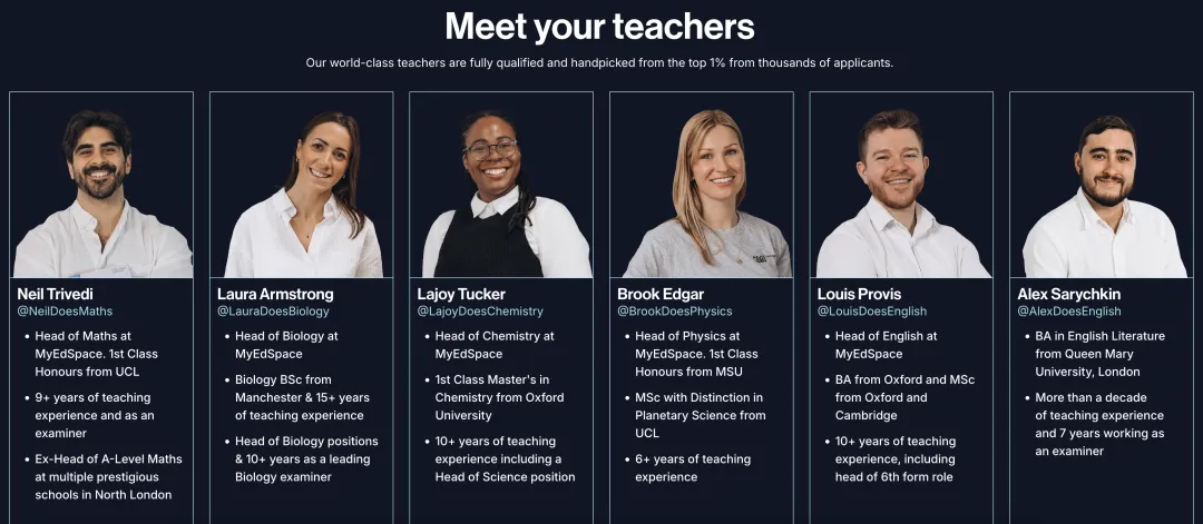 教师均经过严格的选拔,均来自英国顶尖的1%,都是获得 A-Level 最高成绩并就读于剑桥大学、帝国理工学院等英国顶尖大学的学生。他们同时为数千名学生提供现场授课,并已在社交媒体上拥有超过400万的粉丝,以学生熟悉的形式讲解复杂的主题。
