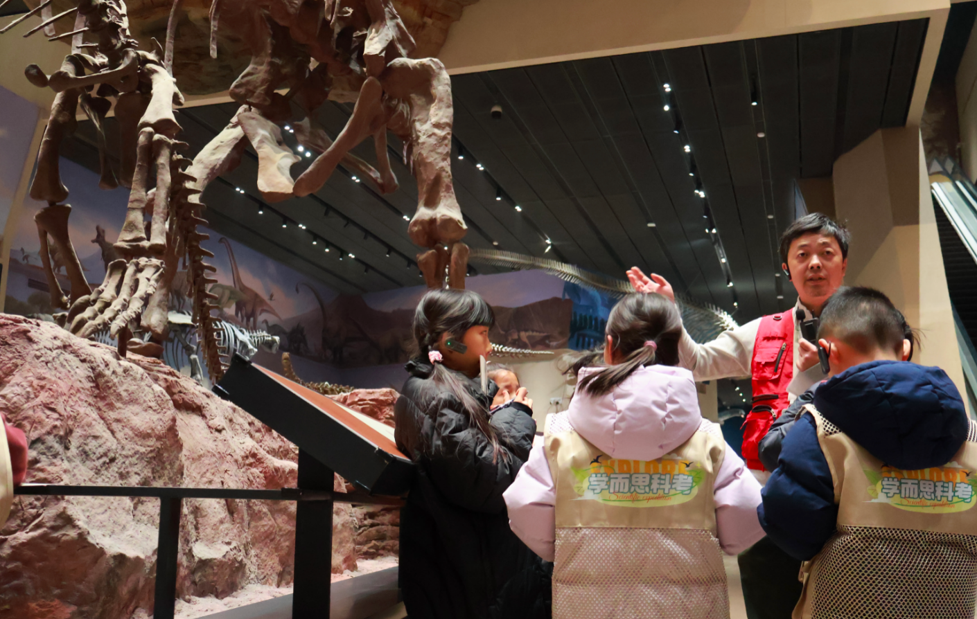 当天傍晚,专家老师带领孩子们沉浸式夜探恐龙展区,详细讲解恐龙知识和生命起源演化的宏伟历程。恐龙和其他爬行动物的区别是什么?世界上发现和命名恐龙最多的是哪个国家?大家度过了知识含量超高的晚上。