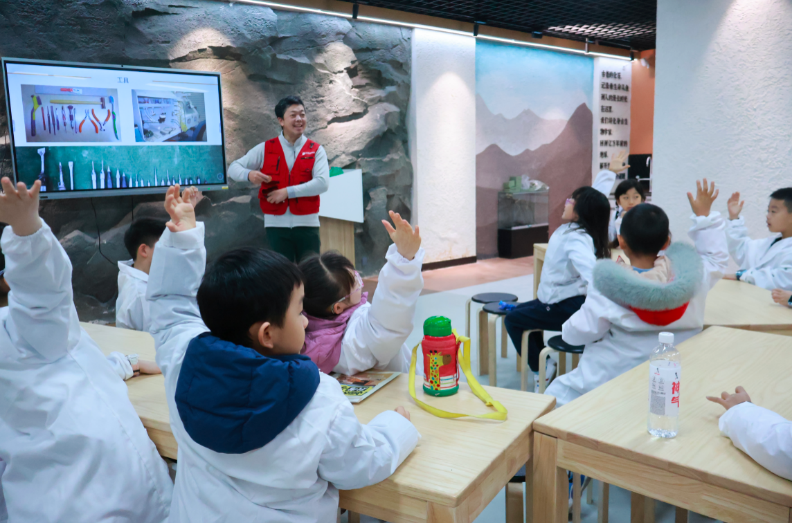 到达展馆后,小学员们给自己取了自然主题的昵称,拿到科考手册和任务卡,在老师带领下参观展馆。从地球的年纪、岩石地貌的分类开始,充分感受到地球的独特和神奇。无生命的地球如何诞生出了最早的生命体?老师坦言现在人类对这个问题还没有明确的答案,期待小朋友们长大后可以研究和回答。