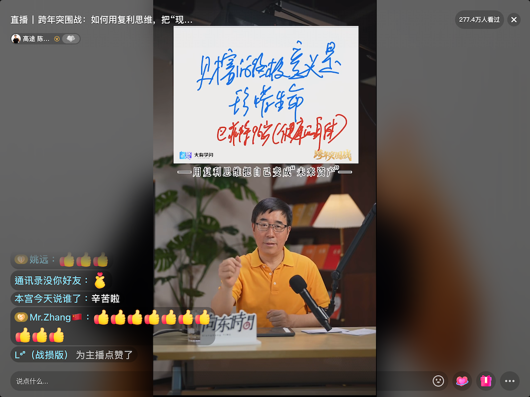 这场两个多小时的直播吸引了超过277万人次观看。直播中,陈向东也不时流露出他标志性的陈氏励志风格: