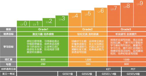 英盼引进和学习了欧美国家成熟的知识体系及分级学习制度,也充分考虑了国内教学大纲和考试大纲要求,并以此为基础独立研发了所有课程内容,共设立了3大等级、9个不同level,可切实满足3-9岁不同年龄段儿童的英语学习需求。