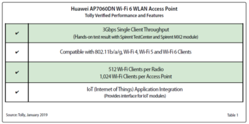 19年3月,国际权威评测机构Tolly Group对华为Wi-Fi 6(802.11ax)AP7060DN进行了性能测评。华为期望通过此次,对AP7060DN的带宽、并发连接数、Wi-Fi 5/4、80.11b/a/g的网络兼容性,以及物联接入的能力进行验证和测试。