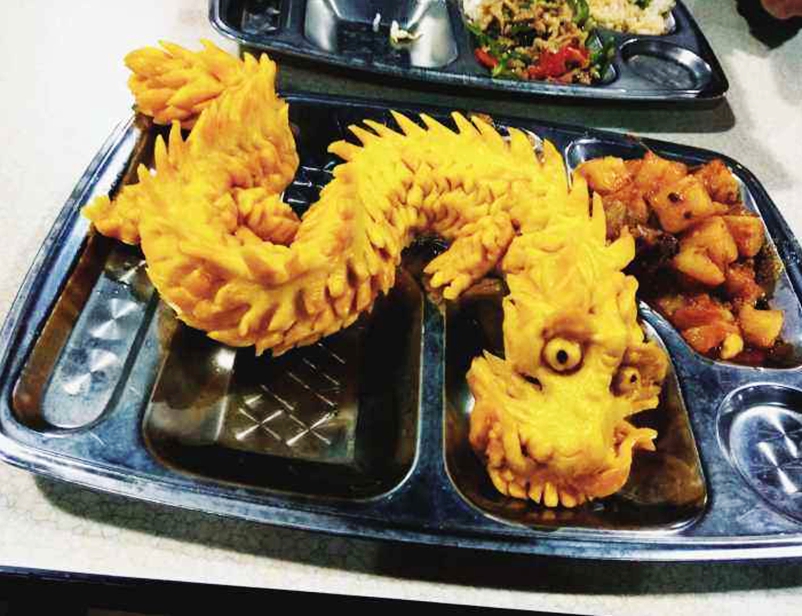 这条栩栩如生的“金龙”,表面上看应该是油条、炸鱼之类的东西,但是有吃过的网友却表示,它其实是一种点心……emmmm,食堂大师傅也是够费心了,居然把“金龙”的造型弄得这么逼真,让人都不好意思下嘴吃了呀!