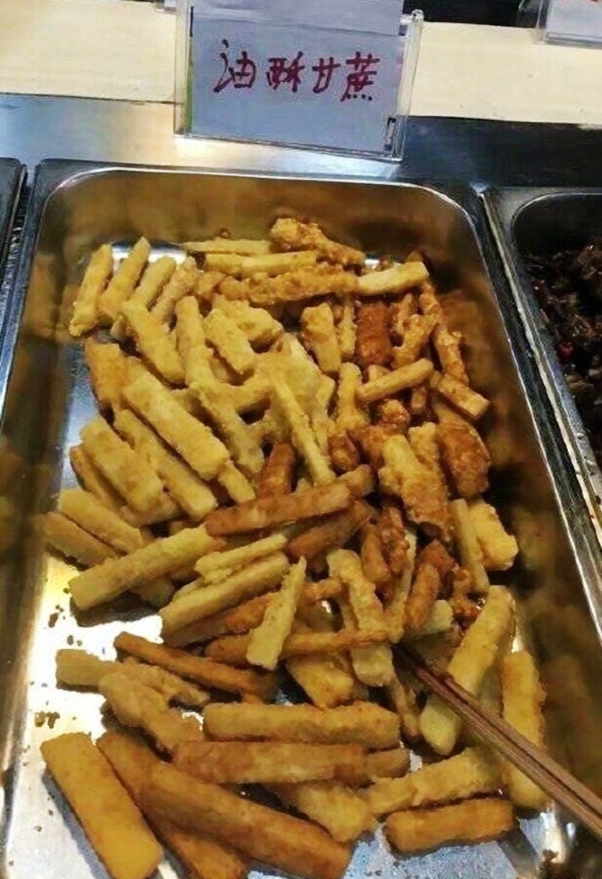 这道脑洞大开的“油酥甘蔗”,光听名字都觉得咽不下去吧?再看看实物图片,貌似和薯条很像的样子,实在是难以想象它的味道!甘蔗居然有这种神奇的做法,也不晓得食堂大厨们都是怎么想到的啊?